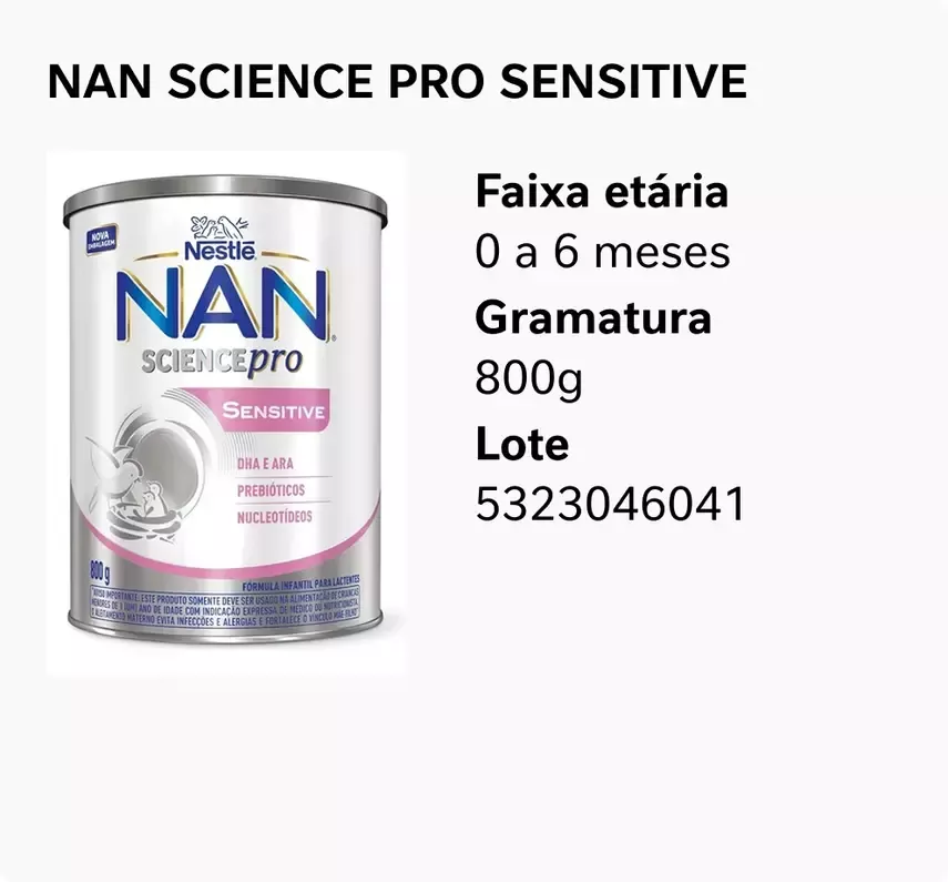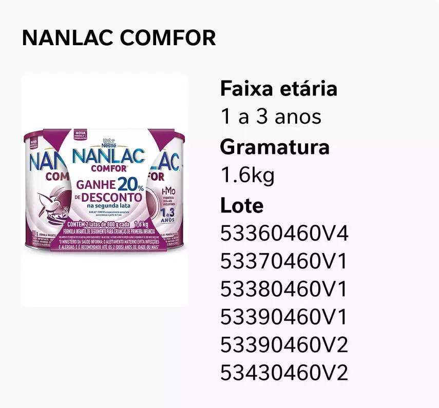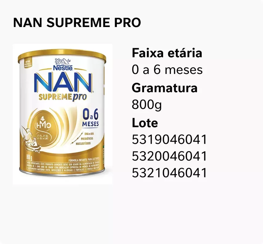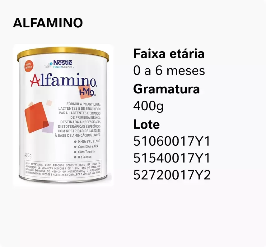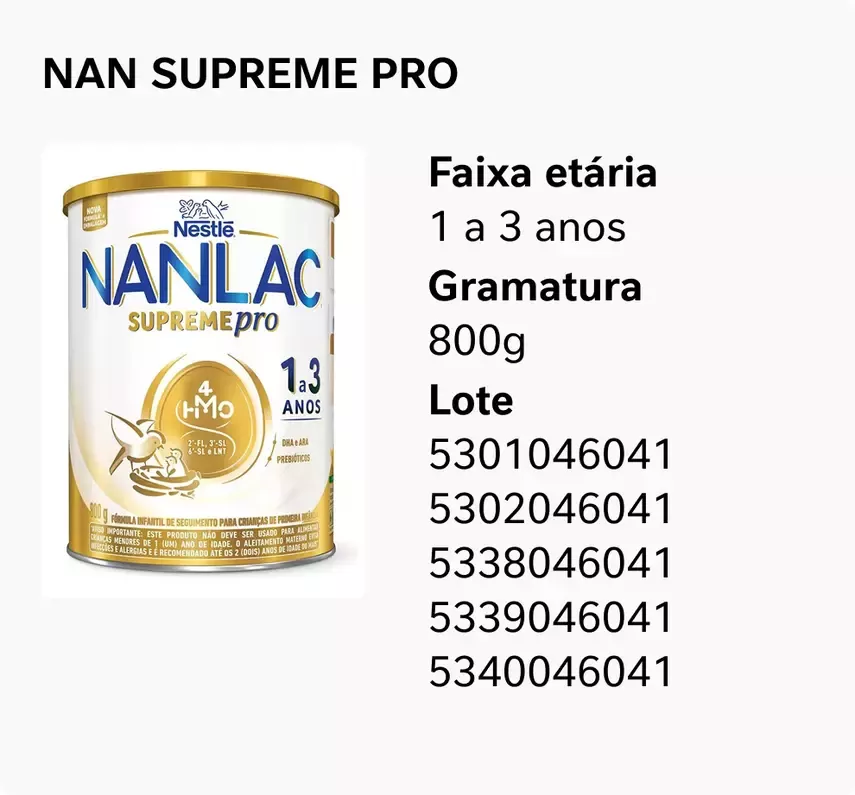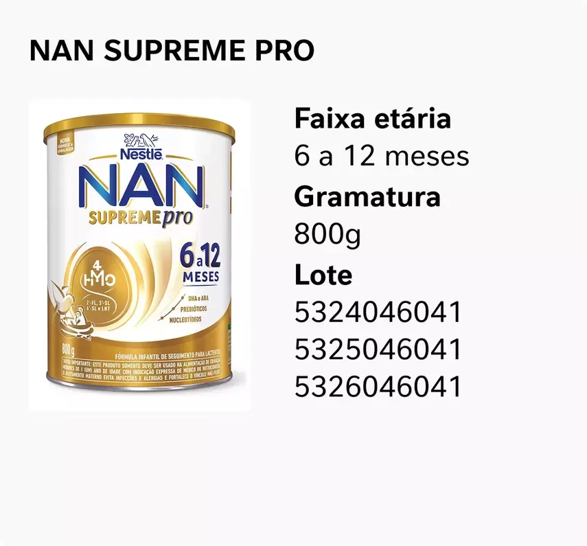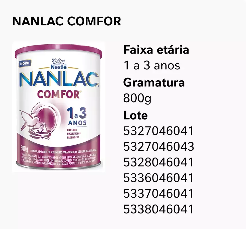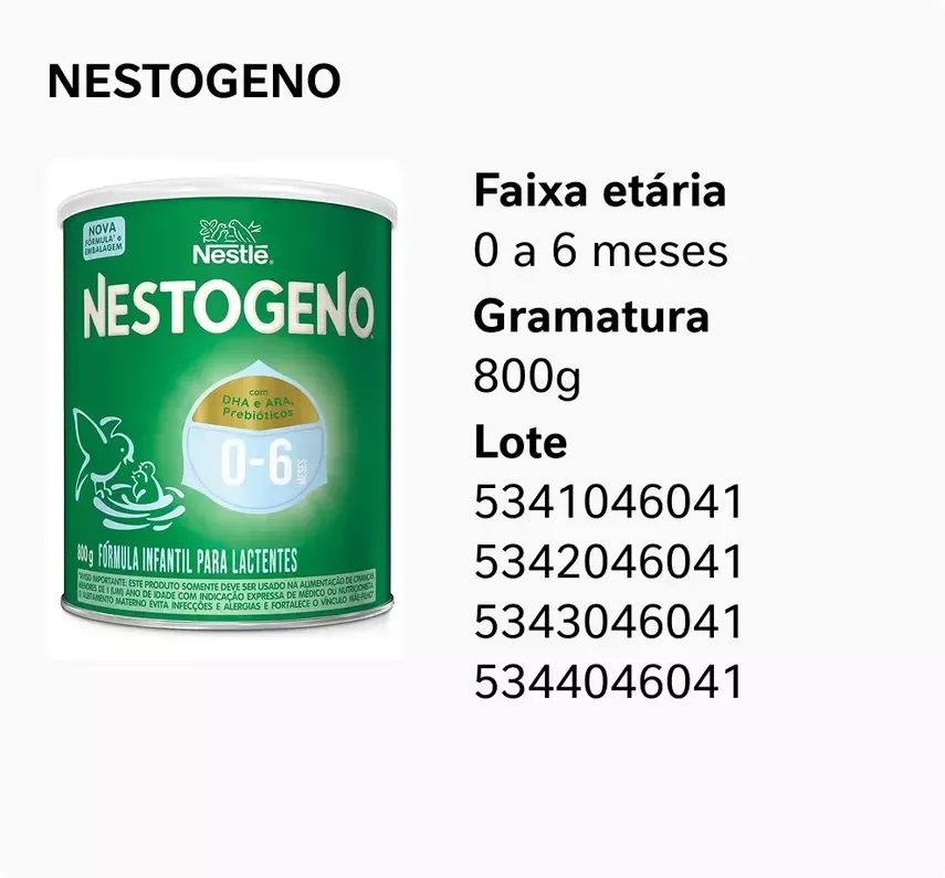 Em seu site, a Nestlé orienta o consumidor a identificar os produtos recolhidos: identificar nome do produto e faixa etária, a gramatura do produto e o número do lote.